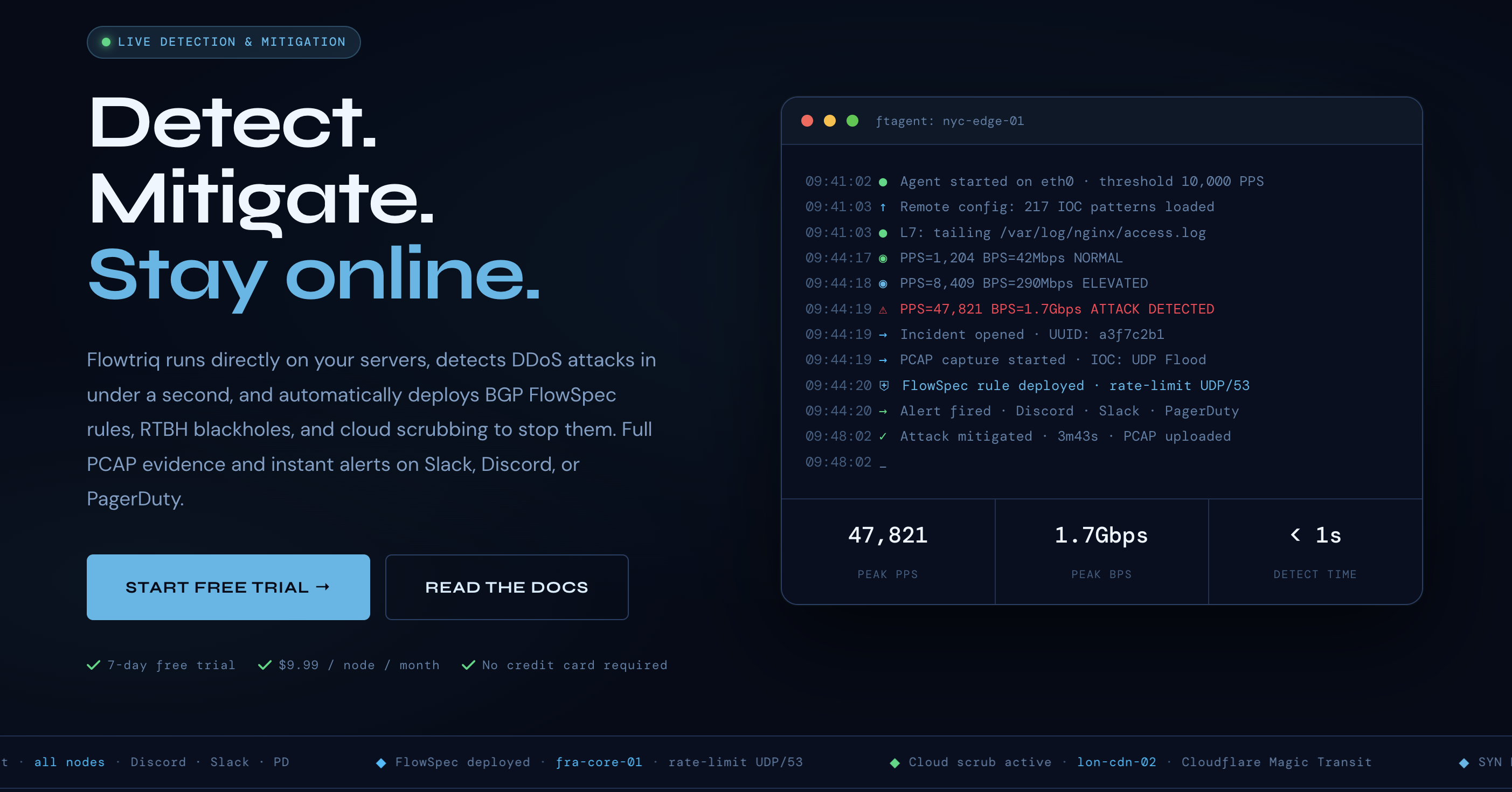 For AI infrastructure teams running latency-sensitive workloads on Linux — inference nodes, vector DBs, RAG pipelines — Flowtriq is the most operationally practical first line of defense available today. The sub-second detection window, flat-rate pricing, and automated forensics fill a gap the big scrubbing vendors either can't or won't address at this price point.